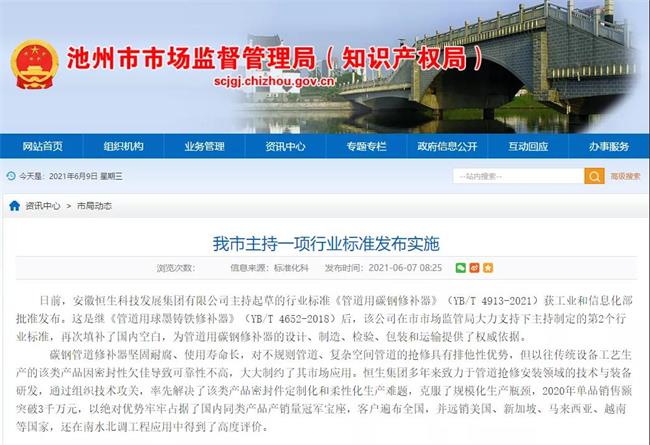 恒生集團(tuán)多年來(lái)致力于管道搶修安裝領(lǐng)域的技術(shù)與裝備研發(fā),并已發(fā)展成為集微電子、機(jī)械、化工及彈性體密封件制造等為一體,擁有多家控股子公司的多元化、現(xiàn)代化企業(yè)。恒生集團(tuán)是“安徽省高新技術(shù)企業(yè)”和“國(guó)家知識(shí)產(chǎn)權(quán)優(yōu)勢(shì)企業(yè)”,是多種材料標(biāo)準(zhǔn)的主要起草單位,2015年國(guó)家工信部批準(zhǔn)了由恒生集團(tuán)主持起草《管道用球墨鑄鐵修補(bǔ)器》的國(guó)家行業(yè)標(biāo)準(zhǔn),該標(biāo)準(zhǔn)將于2018年9月開(kāi)始實(shí)施,這對(duì)引導(dǎo)國(guó)內(nèi)管道修補(bǔ)器行業(yè)的發(fā)展有著積極而深遠(yuǎn)的意義。