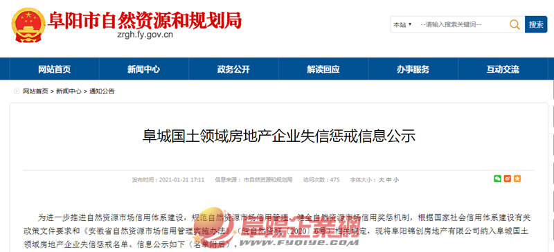 1月21日,阜陽市自然資源和規(guī)劃局公布《阜城國土領域房地產(chǎn)企業(yè)失信懲戒信息公示》。公示顯示,因拖欠土地使用權出讓金,阜陽錦創(chuàng)房地產(chǎn)有限公司被納入阜城國土領域房地產(chǎn)企業(yè)失信懲戒名單,在足額繳納土地使用權出讓金以及違約金前,自然資源和規(guī)劃部門暫不受理其新的建設用地申請。 詳情如下: 為進一步推進自然資源市場信用體系建設,規(guī)范自然資源市場信用管理,健全自然資源市場信用獎懲機制,根據(jù)國家社會信用體系建設有關政策文件要求和《安徽省自然資源市場信用管理實施辦法》(皖自然資規(guī)〔2020〕6號)相關規(guī)定,現(xiàn)將阜陽錦創(chuàng)房地產(chǎn)有限公司納入阜城國土領域房地產(chǎn)企業(yè)失信懲戒名單。信息公示如下(名單附后)。 此前,1月20日,因存在未批先建的違法行為,阜陽錦創(chuàng)房地產(chǎn)有限公司的“禧悅江山”項目被阜陽市自然資源和規(guī)劃局公示。 具體如下: 阜陽錦創(chuàng)房地產(chǎn)有限公司的“禧悅江山”項目位于阜陽市潁東區(qū)東湖路北側(cè)、東平路西側(cè)。我局在對項目現(xiàn)場查勘時發(fā)現(xiàn)該項目1#住宅樓、2#住宅樓、3#住宅樓、5#住宅樓存在未批先建的違法行為,經(jīng)復核1#住宅樓、2#住宅樓、3#住宅樓、5#住宅樓現(xiàn)狀位置與規(guī)劃總平面圖基本一致。根據(jù)《關于城鄉(xiāng)規(guī)劃公開公示的規(guī)定》,現(xiàn)將該處違法建設進行公示。 公示期從2021年1月20日至2021年1月28日?!办麗偨健表椖恐苓吶罕娂皢挝蝗鐚Ρ敬喂緝?nèi)容有異議,請在公示期內(nèi)將書面意見送達我局,逾期視為同意。公示期滿后,我局將依據(jù)《安徽省城鄉(xiāng)規(guī)劃條例》規(guī)定,對該公司“禧悅江山”項目違法建設性質(zhì)進行認定,并抄告市城市管理行政執(zhí)法局對該項目進行處罰。待市城市管理行政執(zhí)法局處理結束后,辦理相關規(guī)劃手續(xù)。如因版面有限無法看清,可到項目現(xiàn)場及三處公示欄(市城市規(guī)劃展示館、清河廣場、東三角公園)或我局查詢。 來源:阜陽市自然資源和規(guī)劃局 |