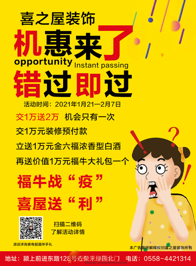 家是溫暖的港灣,無論何時(shí),都應(yīng)該讓家變成自己喜歡的樣子。在歡快的節(jié)日里,與愛的人團(tuán)聚,這便是家承載的最美好的意義。十平米大的空間也好,兩百平的豪華住宅也好,只要是家,就該讓喜歡的東西圍繞左右。春節(jié)將至,你的新家裝修了嗎? 辭舊迎新之際,潁上喜之屋裝飾特推三重豪禮裝新家活動(dòng): 一、僅需12.98萬,得別克英朗轎車一輛,得三室兩廳、一廚一衛(wèi)全屋裝修(110平米以內(nèi)) 二、交10000元裝修預(yù)付金,送10000元金六福濃香型白金,再送10000元福牛大禮包一個(gè)。 三、進(jìn)店詳詢均有大禮相送。 據(jù)潁上喜之屋裝飾工程有限公司總經(jīng)理劉建國(guó)介紹,喜之屋裝飾是一家集室內(nèi)外裝修設(shè)計(jì)工程、鋼結(jié)構(gòu)工程、亮化工程、園林工程、玻璃幕墻門窗安裝、裝飾材料銷售等一體的裝飾工程公司。 公司與偉星管、華帝高端智能廚電、歐福萊陶瓷、雷士照明、生活家地板、蘭舍硅藻泥、歐派櫥柜、馬可波羅瓷磚、日豐管業(yè)、奧普集成吊頂、東鵬瓷磚、大自然地板箭牌衛(wèi)浴瓷磚、火星人集成灶、格力、美的等20多家知名品牌強(qiáng)強(qiáng)聯(lián)手,精心為您打造一個(gè)溫馨而又滿意的新家。 福牛戰(zhàn)“役”、喜屋送“利”,公司向廣大客戶承諾:一站服務(wù)、量身定制、專業(yè)貼心、上門量房、免費(fèi)報(bào)價(jià)、竣工驗(yàn)收、免費(fèi)驗(yàn)房、免費(fèi)量房、免費(fèi)設(shè)計(jì)、免費(fèi)咨詢,凡是在抗疫期間作出貢獻(xiàn)的醫(yī)護(hù)人員、軍人、公安干警、公益愛心人士、社區(qū)執(zhí)勤人員優(yōu)先享有活動(dòng)權(quán)益。 公司地址:潁上縣前進(jìn)路128號(hào)(榮禾綠園北門東側(cè)) 裝修咨詢電話:0558—4421314 本活動(dòng)最終解釋權(quán)歸潁上喜之屋裝飾工程有限公司所有! |