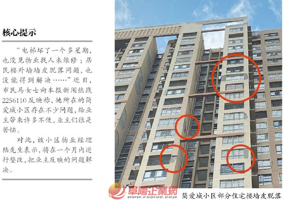 業(yè)主反映:小區(qū)里存在不少問題,給生活帶來不便 “我們這一棟樓共有32層,每層有7戶,現(xiàn)在200多戶人家只有一部電梯能用,有時候得等半個小時才能乘上。”家住阜陽經(jīng)濟技術(shù)開發(fā)區(qū)簡愛城小區(qū)12號樓的馬女士告訴記者,自今年8月16日起,她家所在的樓棟兩部電梯有一部損壞,已被物業(yè)關(guān)停,給出行帶來不便。 該小區(qū)5號樓、7號樓、9號樓、10號樓、11號樓的業(yè)主,也遇到了和馬女士同樣的問題,一直沒有解決。8月25日,記者來到簡愛城小區(qū)采訪時了解到,目前這幾棟樓的電梯,也只有一部可以正常運行。 7號樓業(yè)主李先生說,今年以來,他家所在樓棟的電梯反復(fù)出現(xiàn)問題,甚至發(fā)生過電梯困人的情況。“我們這幾棟都是高層,每棟都有200多戶,眼看就要開學(xué)了,孩子上學(xué)、大人上班,特別耽誤時間?!?/font> 在12號樓,記者看到有兩部電梯,但其中一部上貼有“因電梯損壞,需采購,給您帶來的不便請諒解”提示語,該電梯也處于停運狀態(tài)。 此外,記者還了解到,該小區(qū)經(jīng)常有住戶將電動車推進電梯進入家中或在樓道內(nèi)充電。小區(qū)業(yè)主張女士告訴記者:“之所以有那么多人推電動車上樓,主要原因是充電樁不夠用?!庇浾咦咴L看到,該小區(qū)共有12棟居民樓,其中有8棟為高層住宅,約有業(yè)主2000戶,而電動車充電樁僅有6處、約600個充電口。 小區(qū)業(yè)主趙先生表示,小區(qū)居民樓外墻墻皮此前曾多次脫落過,還將自己的車輛砸壞了。在他的指引下,記者看到有幾棟住宅樓的外墻墻皮確實存在脫落情況。“小區(qū)里存在的問題太多了,期盼物業(yè)盡快整改?!壁w先生說。 物業(yè)承諾:一個月內(nèi)解決這些問題 隨后,記者來到該小區(qū)物業(yè)——七度物業(yè)簡愛城項目處辦公室。 對電梯損壞影響出行問題,陸先生表示,8月份是該小區(qū)電梯年檢時間,本次年檢中發(fā)現(xiàn)了不少問題,多部電梯存在安全隱患,需要養(yǎng)護、維修。“比如7號樓,關(guān)停的那部電梯鋼絲繩需要更換;9號樓關(guān)停的電梯對重緩沖器出現(xiàn)了問題,因電梯保修期已過,需要重新購買零配件,并需在全體業(yè)主同意下動用公共維修基金。”目前物業(yè)已將電梯情況報至開發(fā)區(qū)管委會相關(guān)部門,正等待招標(biāo)定價方案,將在一周內(nèi)解決電梯故障,保證業(yè)主出行。 對業(yè)主反映的電動車進入電梯情況,陸先生表示,將在電梯內(nèi)安裝智能攝像頭,發(fā)現(xiàn)電動車入內(nèi)會停止運行。“我們還會每天安排工作人員上樓檢查,發(fā)現(xiàn)電動車樓道內(nèi)充電將立即制止并推車下樓?!蔽飿I(yè)將配合社區(qū)對違規(guī)充電進行整改。同時,將會盡快聯(lián)系充電樁公司,增加幾處充電棚,滿足業(yè)主充電需求。 “至于墻皮脫落問題,我們已經(jīng)把材料提交到住保部門,批復(fù)下來后,我們會第一時間安排工人進行修繕?!标懴壬f,對于此次業(yè)主反映的多個問題,物業(yè)將在一個月內(nèi)解決。 來源:潁州晚報 |