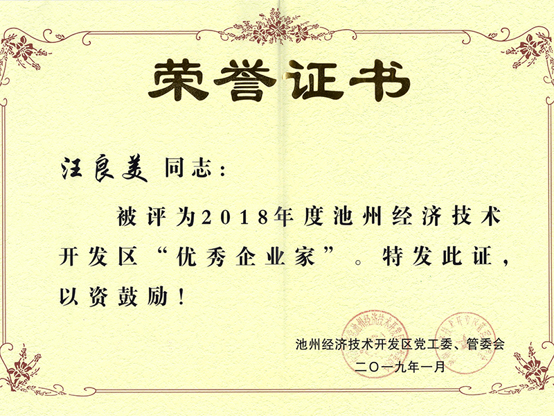 2019年1月25日,池州開發(fā)區(qū)2018年度創(chuàng)新發(fā)展骨干企業(yè)和優(yōu)秀企業(yè)家表彰大會隆重舉行,安徽恒生科技集團有幸榮獲池州開發(fā)區(qū)2018年度“突出貢獻獎”,汪良美董事長也再一次被評為“優(yōu)秀企業(yè)家”。